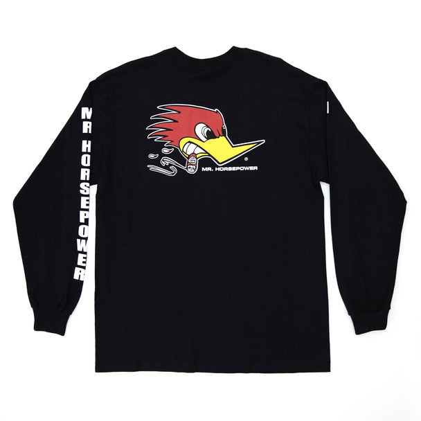 O famoso pica-pau mascando charuto do automobilismo, “Mr. Horsepower”, é estampado em silk screen na frente e nas costas, junto com seu nome impresso em texto ao longo das mangas, em nossa camiseta preta de manga longa de alta qualidade, 6,0 oz, 100% algodão jersey pré-encolhido.